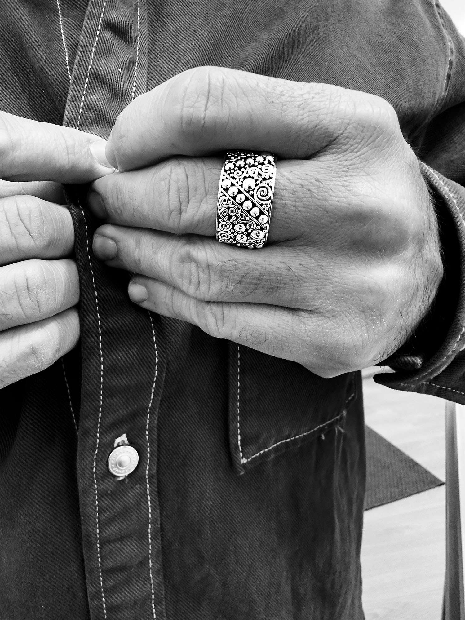 The Orito Ring is one of our most intricate pieces. The exterior is adorned with meticulously handcrafted filaments and small spheres of varying sizes and positions, while the interior features the distinctive ‘S’ shaped spirals engraved within. This uniquely crafted ring serves as a statement piece, with each one possessing subtle variations, ensuring that no two are ever identical. Measure: The width of the ring is 15mm.