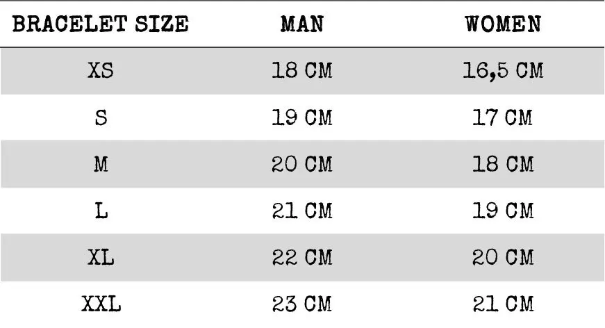 Our bracelets are sized in centimeters. The best way to find out the size of your bracelet is to measure your wrist with a flexible tape measure or with a non-elastic cord or cord or lace. Wrap the tape measure around your wrist, under your bone. It should not be too tight as it should be able to move around the wrist. Adjust it as if it were the bracelet itself. If in doubt, we suggest that you choose the larger size. Bracelets made out of chain, can be shortened. If you need a bigger size than the one in stock we will make a new one. If you are not sure about sizing, contact us and we will assist you during the purchase.
