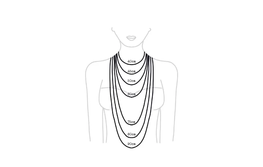 The chains are available in different lengths. We use centimeters to measure ours. Use the guide below to determine the length that suits you best. Another way is to fasten a flexible tape measure or any non-flexible cord to your neck to find the desired length.