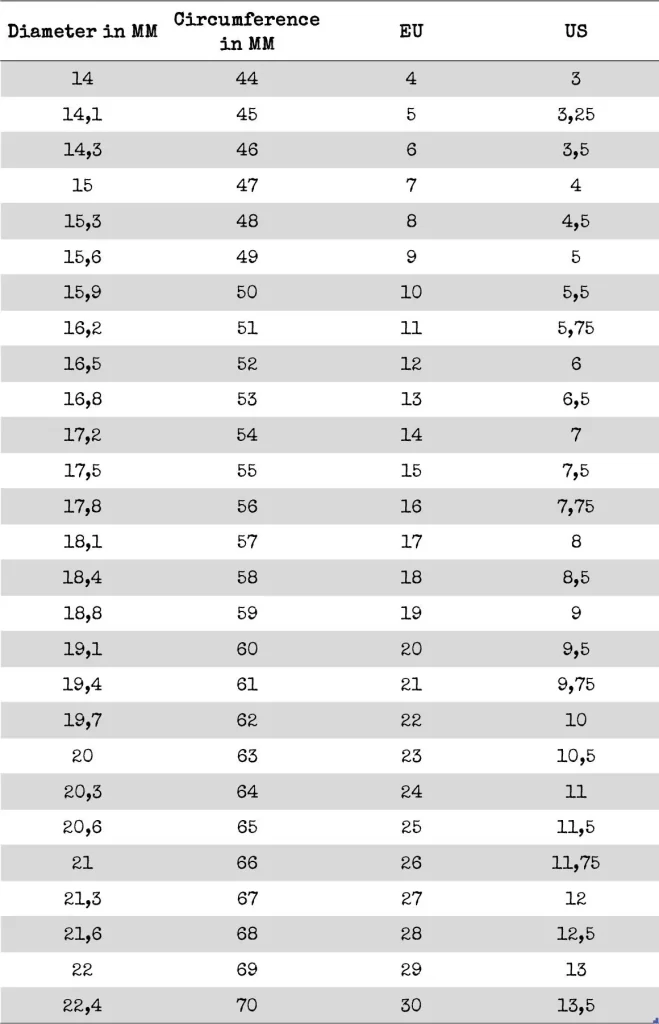 Download the printable ring size chart. Make sure that the “Adjust Print Area” option in the print dialog box is disabled before printing. We suggest you to check with a ruler that the printed version matches real size. After, place your ring over the circles below to determine which one fits yours.The diameter must match exactly with the one of your ring. If you hesitate between 2 sizes, we suggest to choose the bigger one. Have in mind that Ethnopur uses the EU sizing.