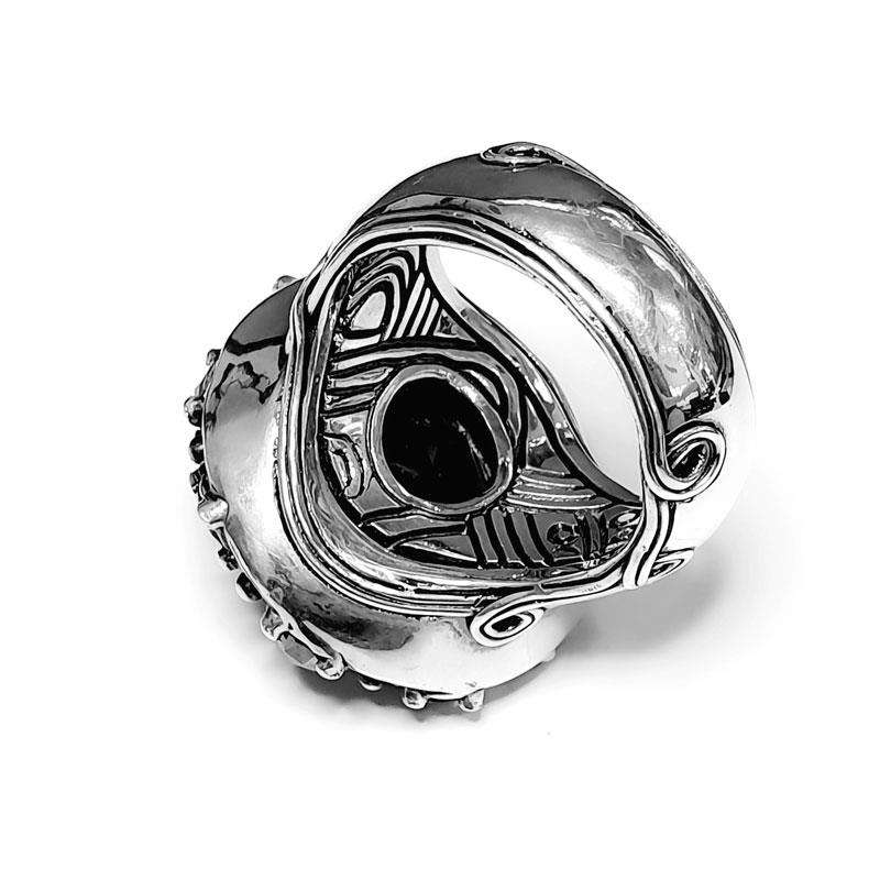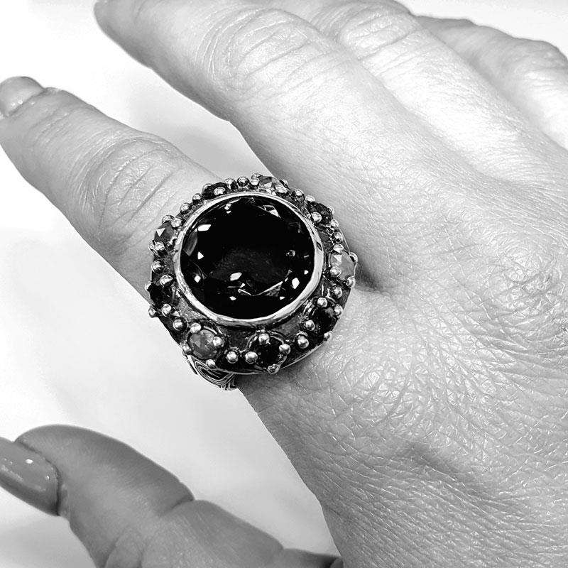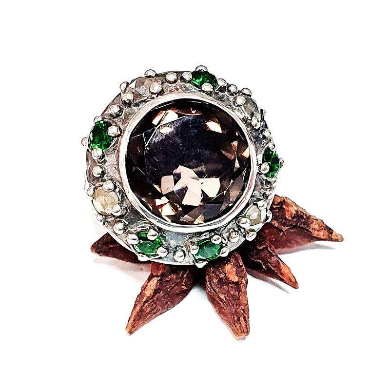 The Smokey Quartz Pingir ring features a central smokey quartz which is surrounded by tsavorites and rough diamonds. A delicate motif adorns the ring circumference and the inside is engraved. Made in silver.