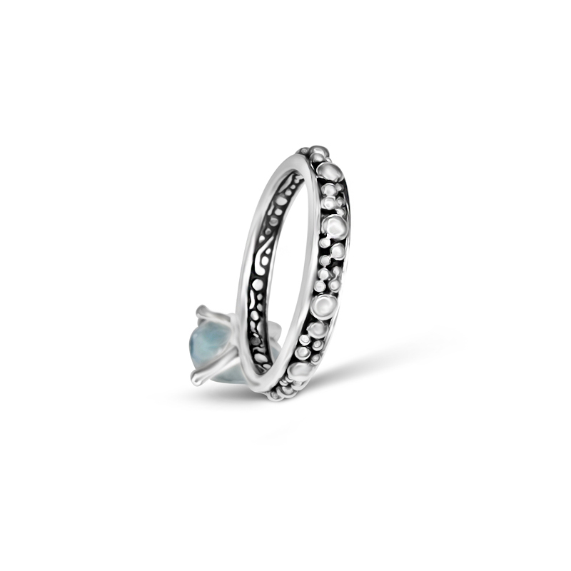 The band is adorned with intricate details inspired by traditional granulation techniques, enhancing its artisanal character. It also includes an engraved motif on the inner side of the ring, adding a distinctive and exclusive detail.