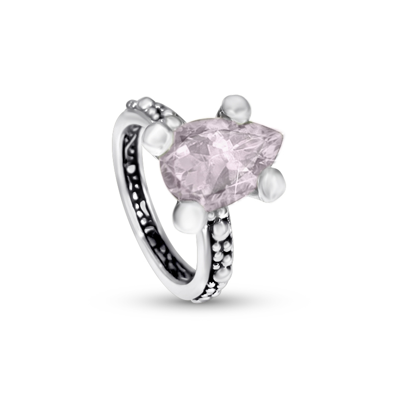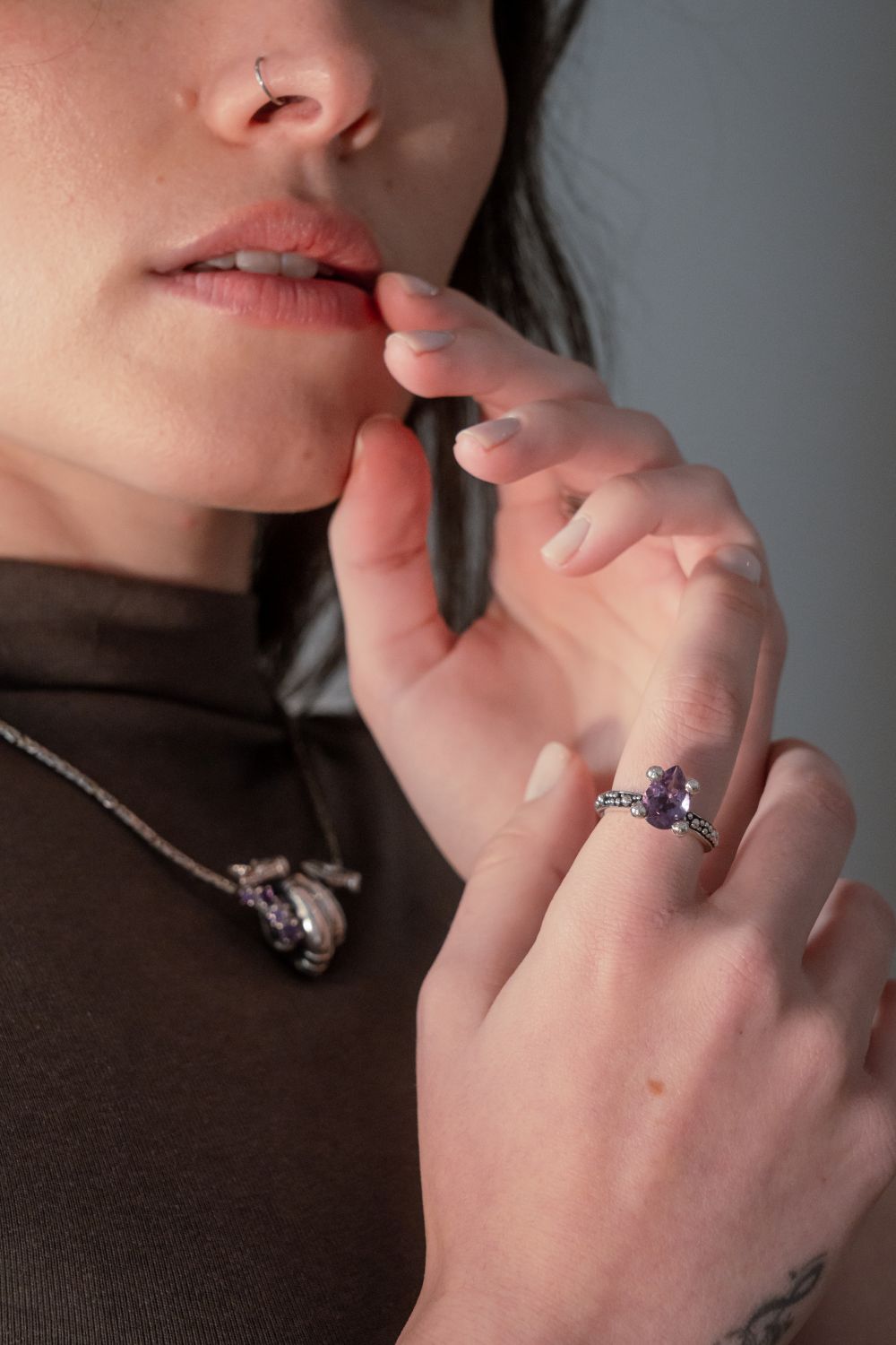 This elegant ring is crafted in sterling silver and features a beautiful combination of Rose Quartz and Amethyst gemstones in pear shapes measuring 12 x 8 mm. The gentle pink hue of Rose Quartz blends harmoniously with the rich violet tones of Amethyst, creating a refined and feminine composition.