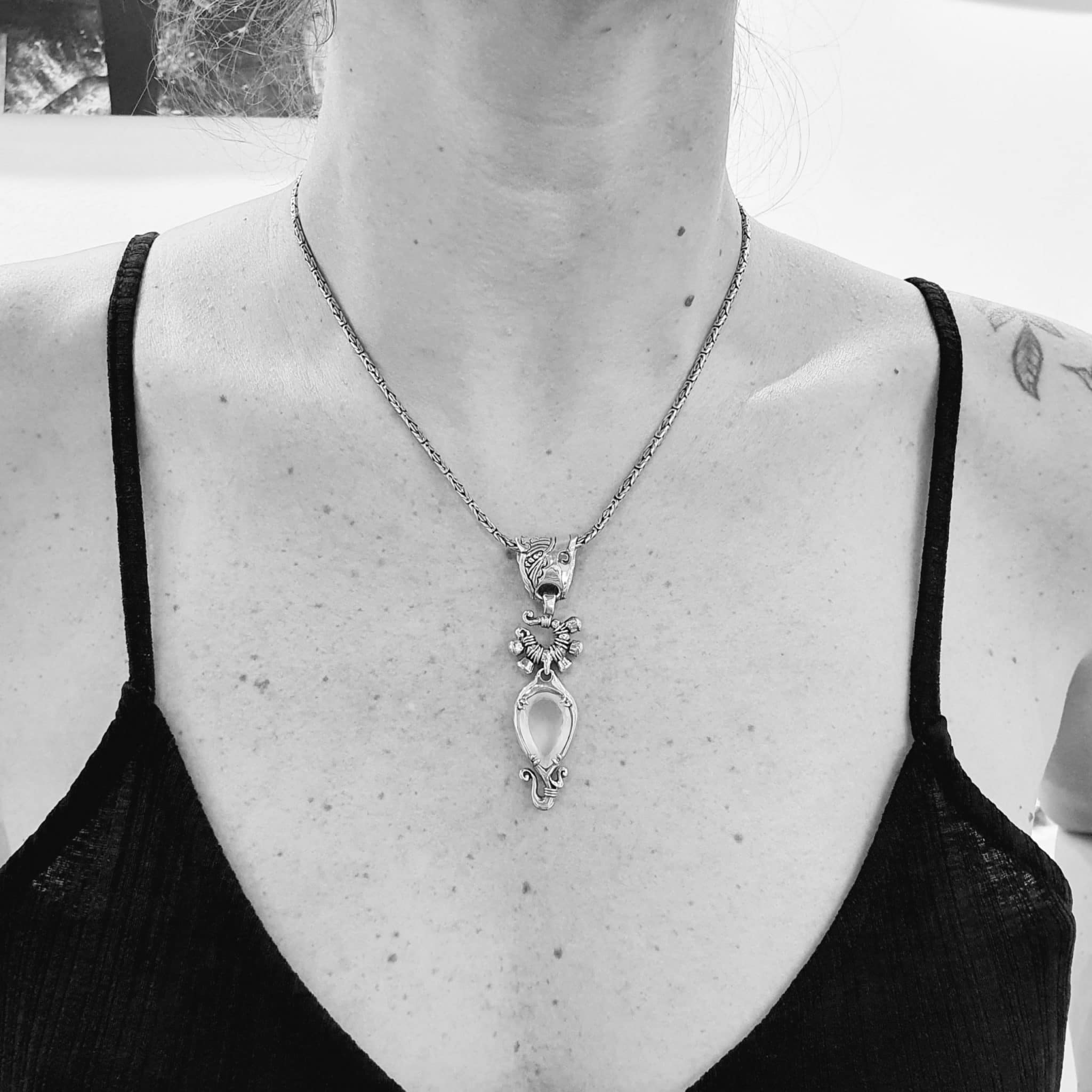Part of the Miao Collection, this pendant displays a rose quartz and gold details in the spikes. Total heigth 65mm