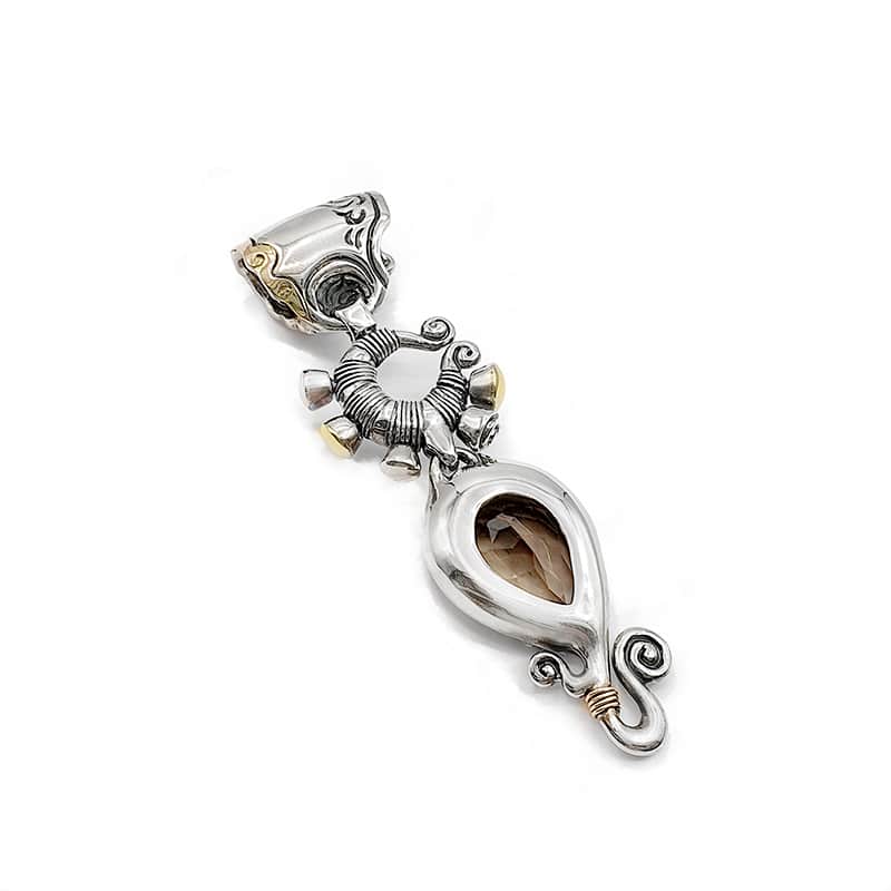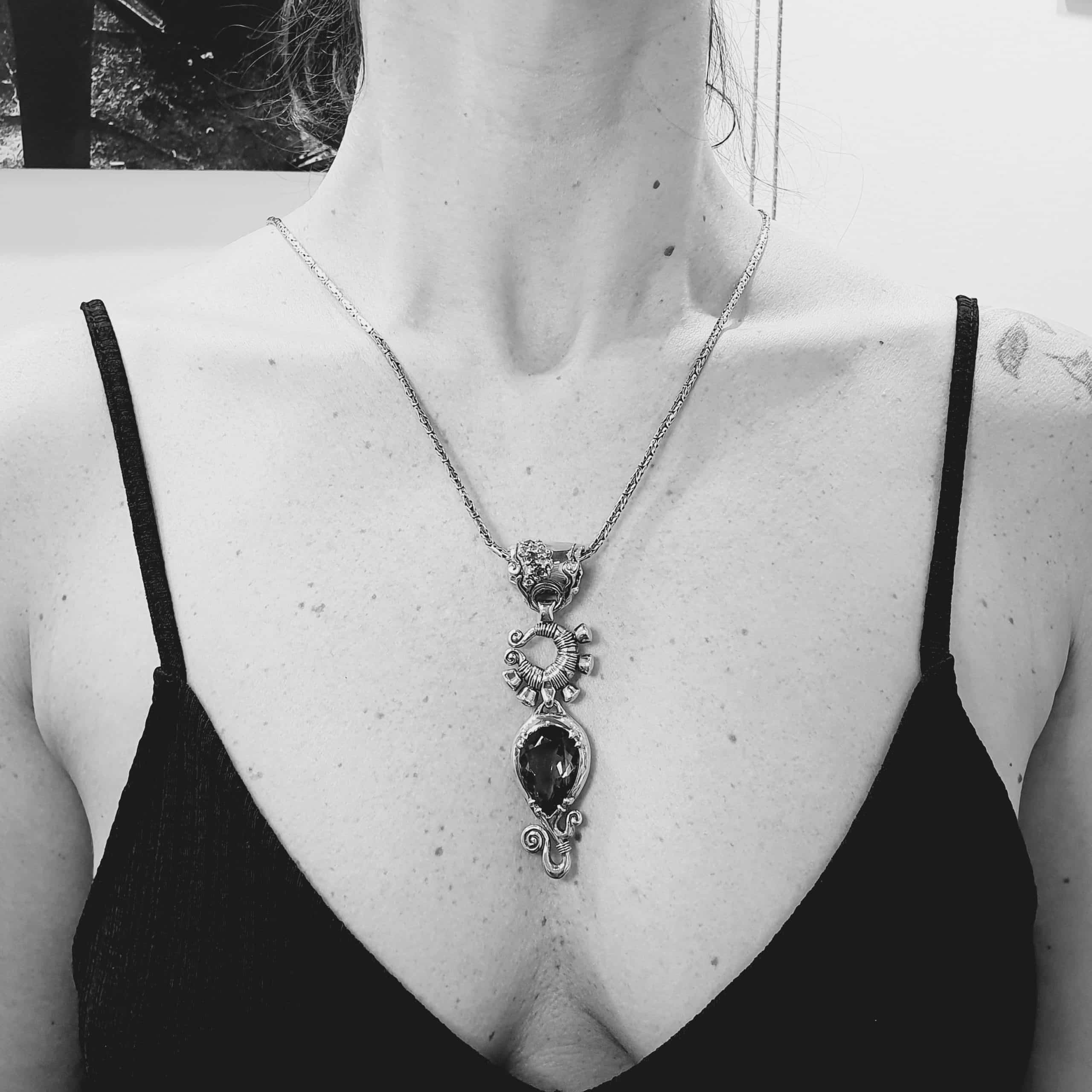 Spirals and spikes pendant. Dropped smoky quartz pendant, decorated with Diamonds, Sapphires and Gold details.