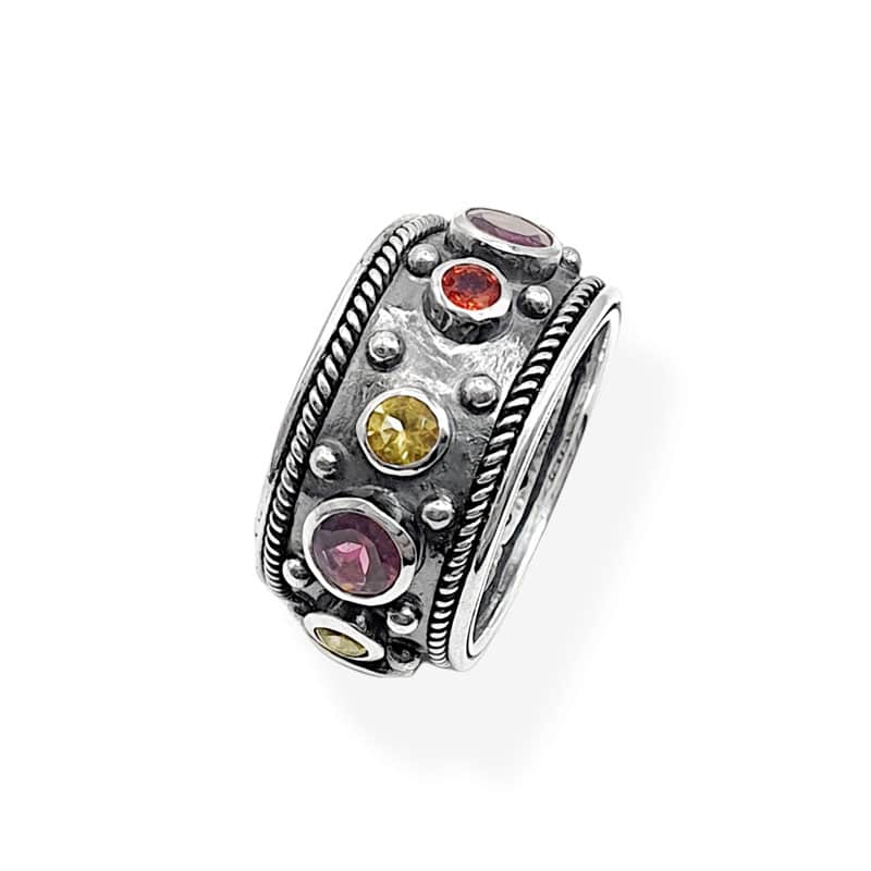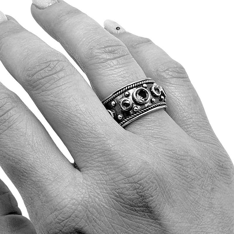 The Sudan Ring was carved in wax and forged later in silver. It was adorned with balls and wires and setted with a Amethysts, Tourmalines and sapphires.