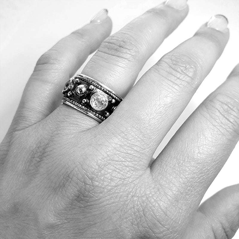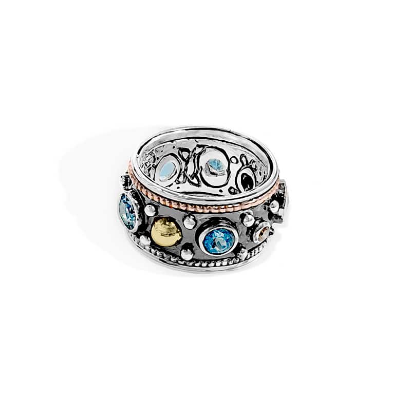 The Sudan Ring was carved in wax and forged later in silver. It was adorned with gold balls and wires and setted with a blue topaz, dark diamonds and sapphires.
