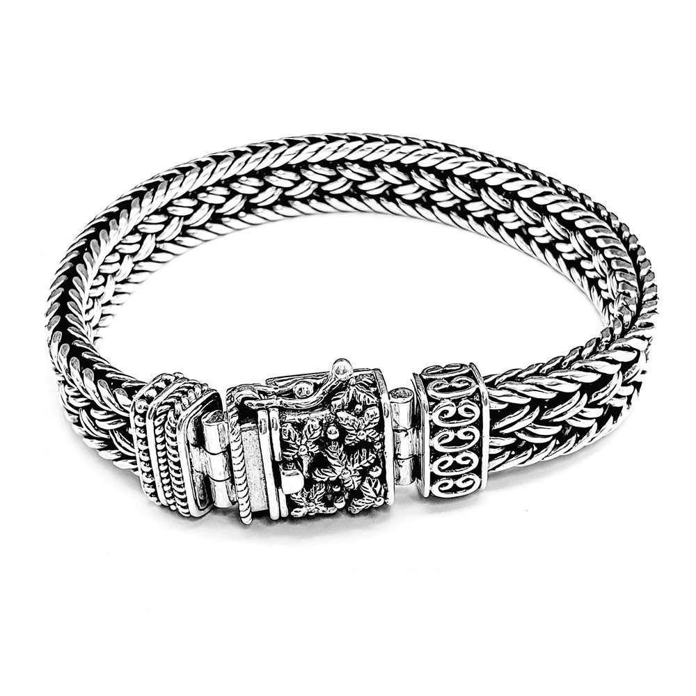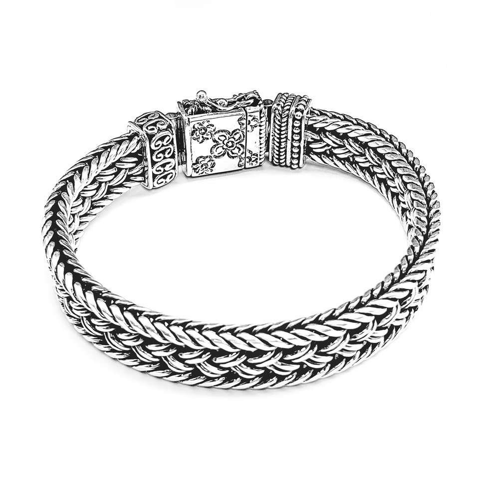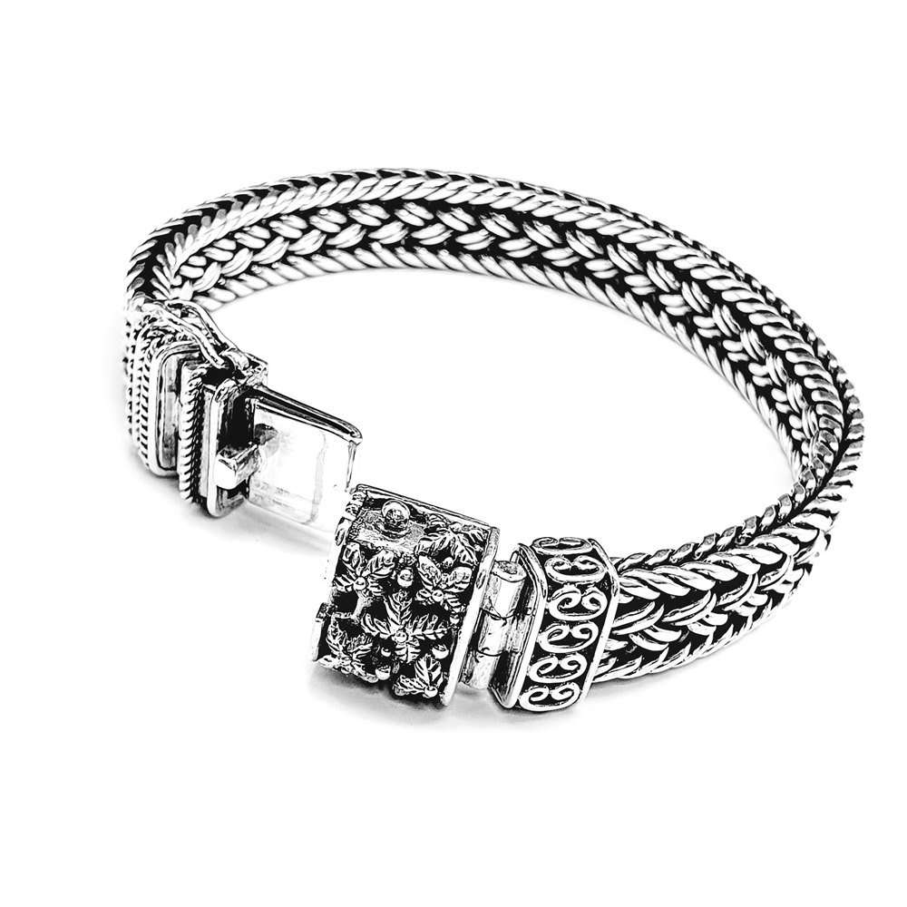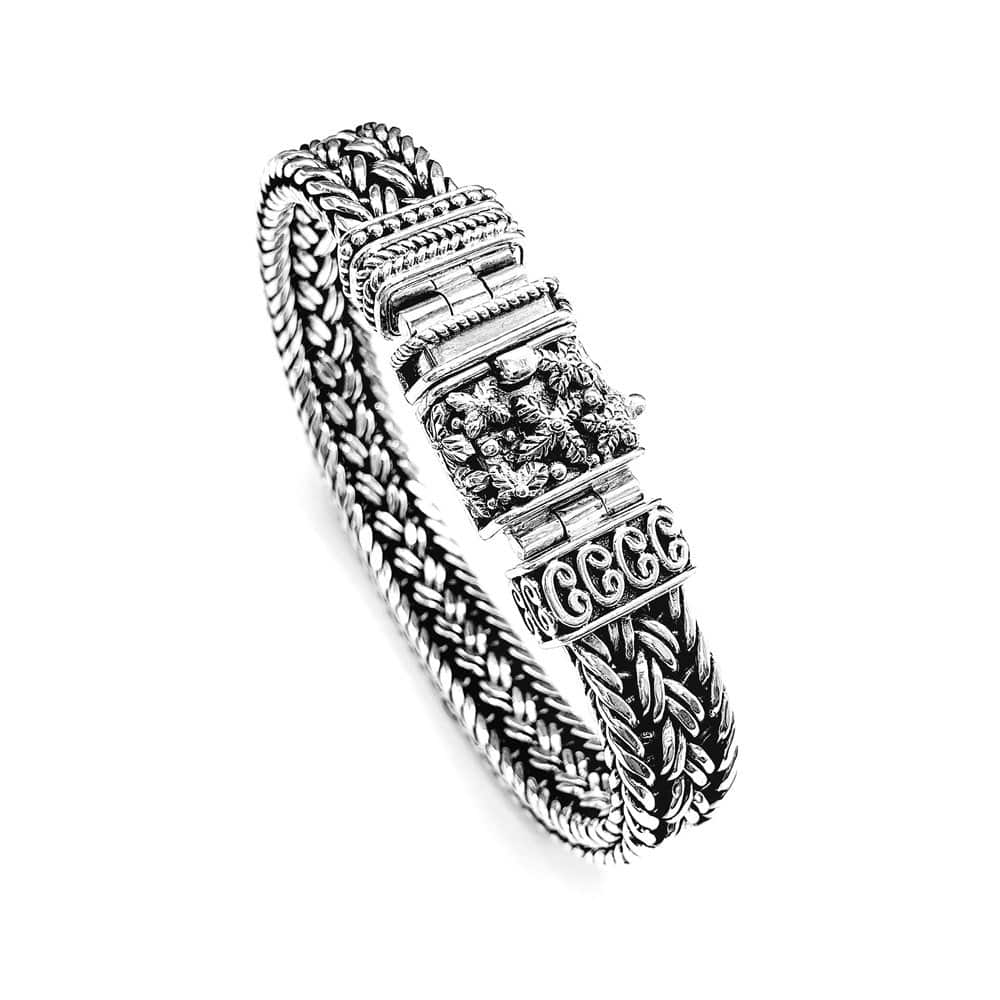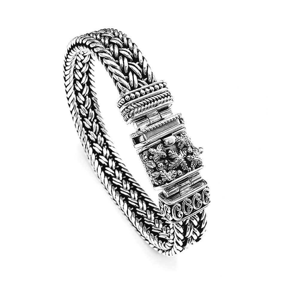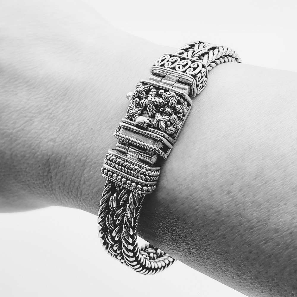 Sulawesi Handweaved silver bracelet, one of a kind closure decorated with Sulawesi flower motif. 10mm width and 18cm length.