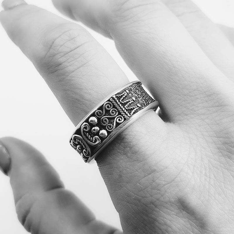 Timor Black Ring Handmade In Silver with typical motifs. Spirals, balls, braids and wires are endemic in the Austronesian Archipelago. Treated to create the black effect