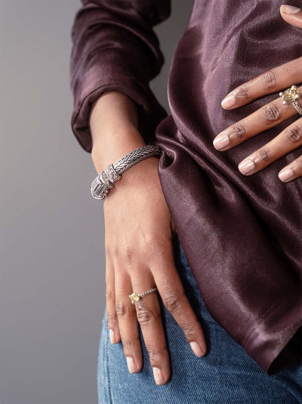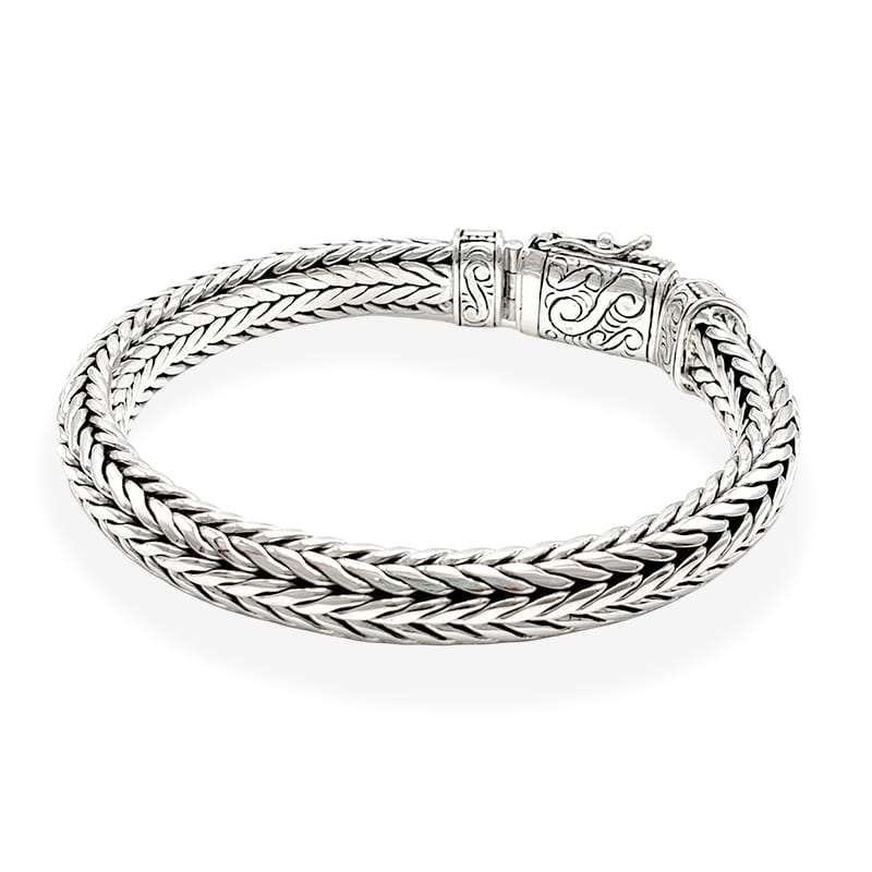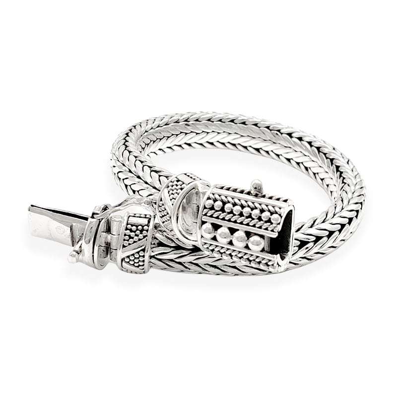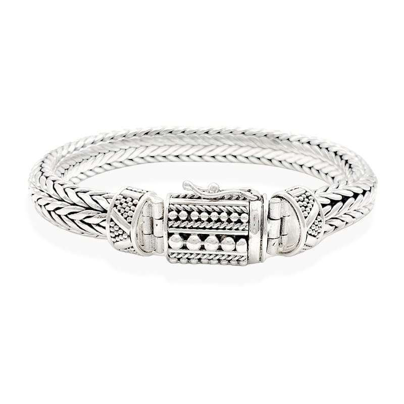 This bracelet is characterised by its intricate braided silver wire structure, forming a compact 10mm wide band that balances solidity and elegance. The surface is enriched with traditional “S”-shaped spirals, a recurring motif in Indonesian jewellery representing continuity and life energy.