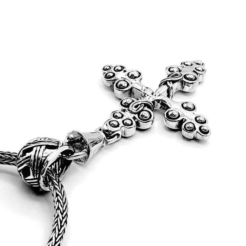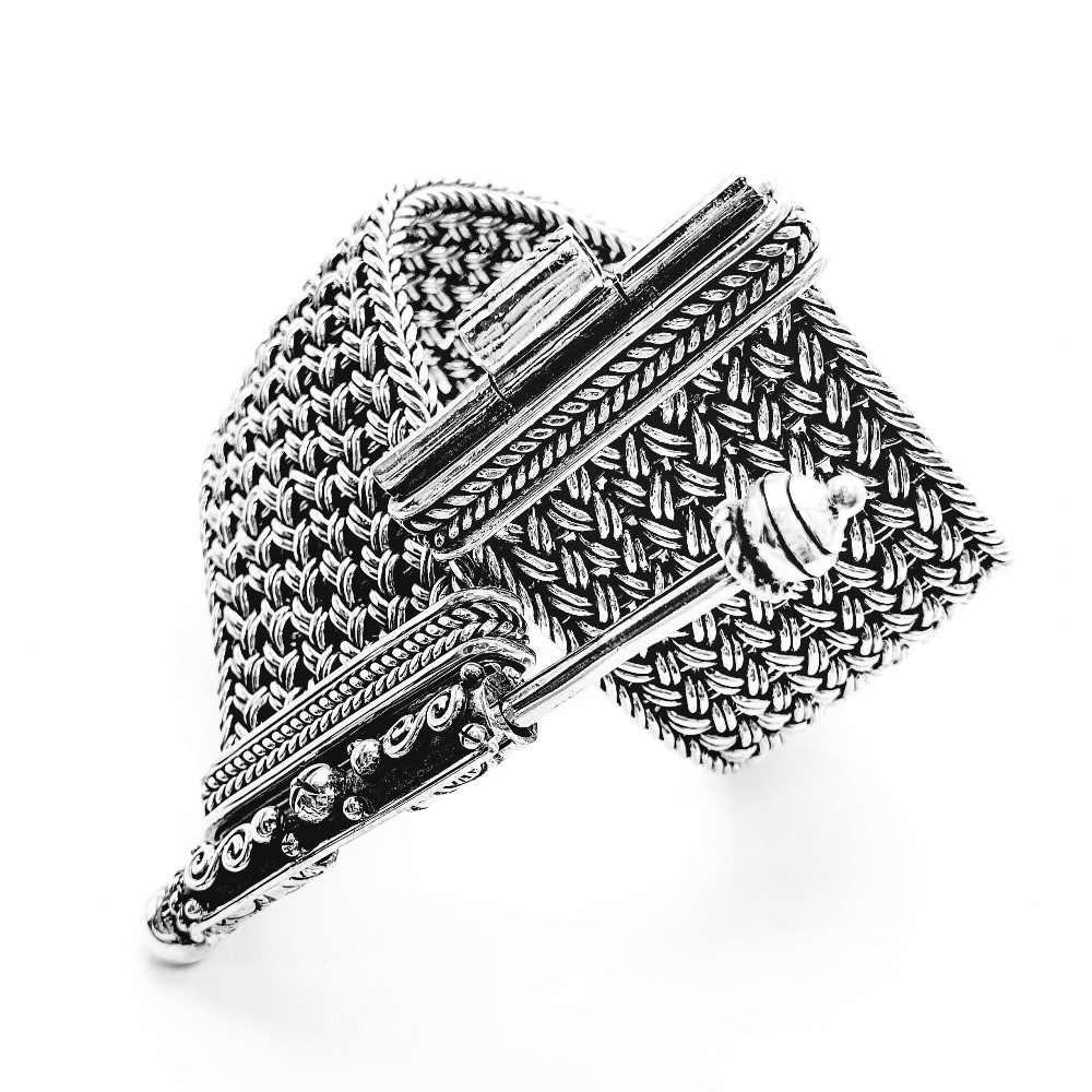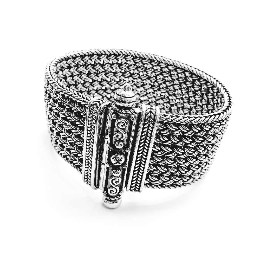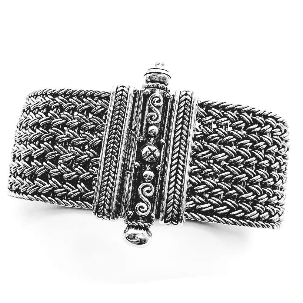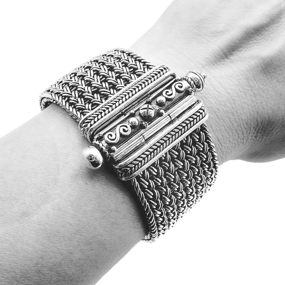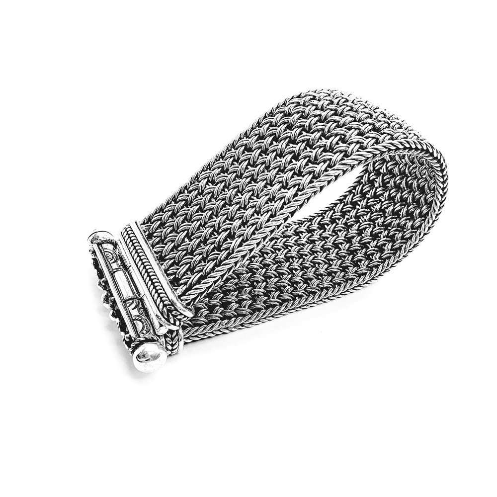 This bracelet is entirely handcrafted in premium 925 sterling silver using a complex mesh-weaving technique combined with braided wirework and granulation. The wide 30 mm structure gives the piece a powerful visual presence while maintaining flexibility and comfort.