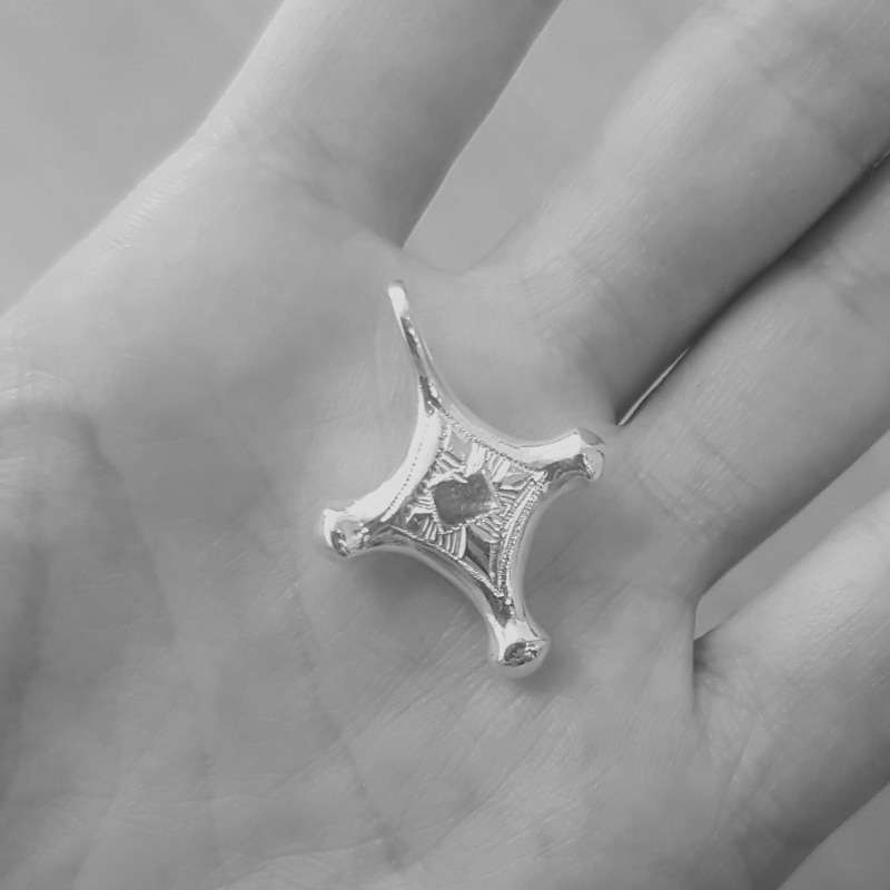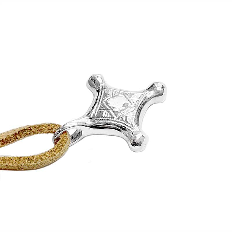 The Tuareg Cross Mini is made in solid pure silver, by hammering and filing a solid metal ingot. The total size is 20 x 25mm. It comes with a synthetic leather cord to hang it.