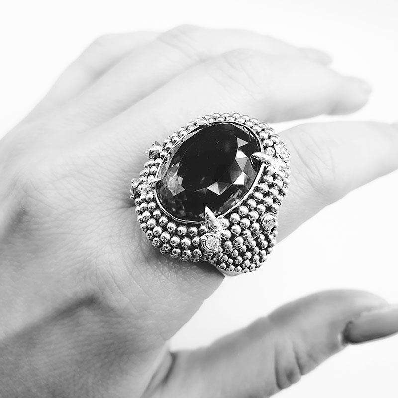 The Twisted Penjuri Handcrafted Ring is featuring a central oval amethyst and little diamonds between the balls decoration. Inspired in an antique piece from Rajasthan this ring was handmade in our workshops.