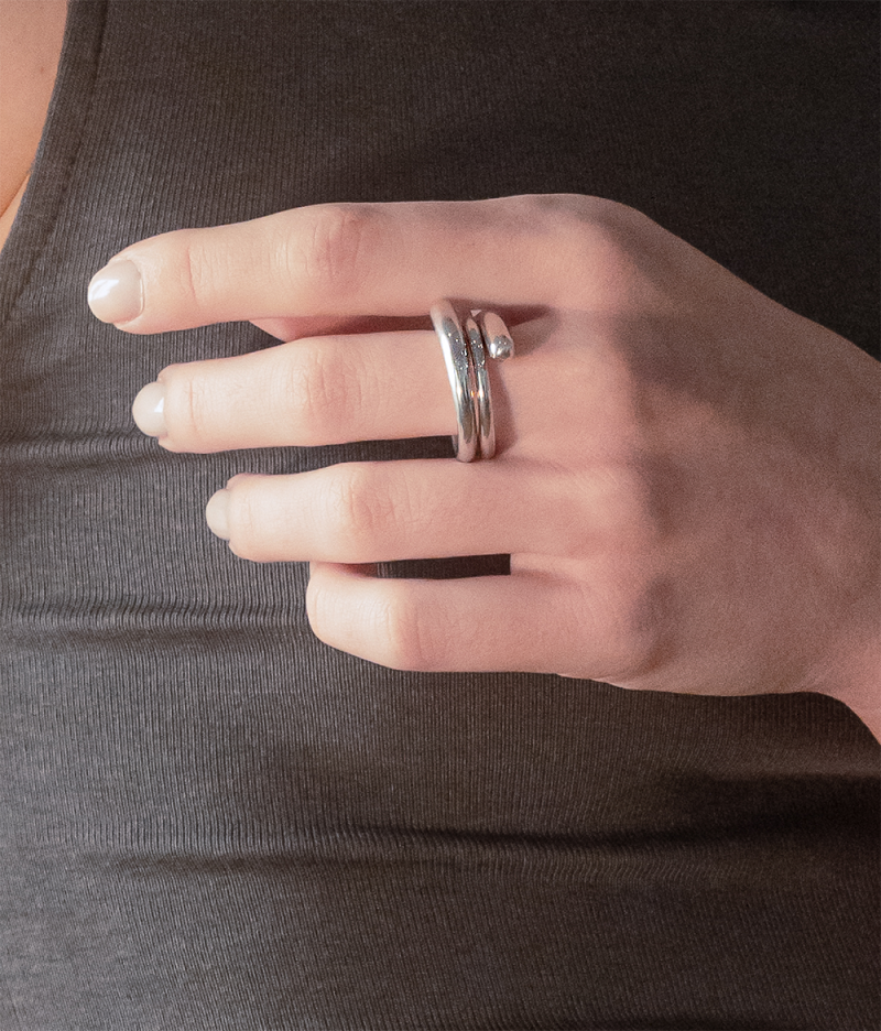 The ring can be slightly adjusted by gentle pressure, allowing it to adapt comfortably to different finger sizes while maintaining its distinctive form.