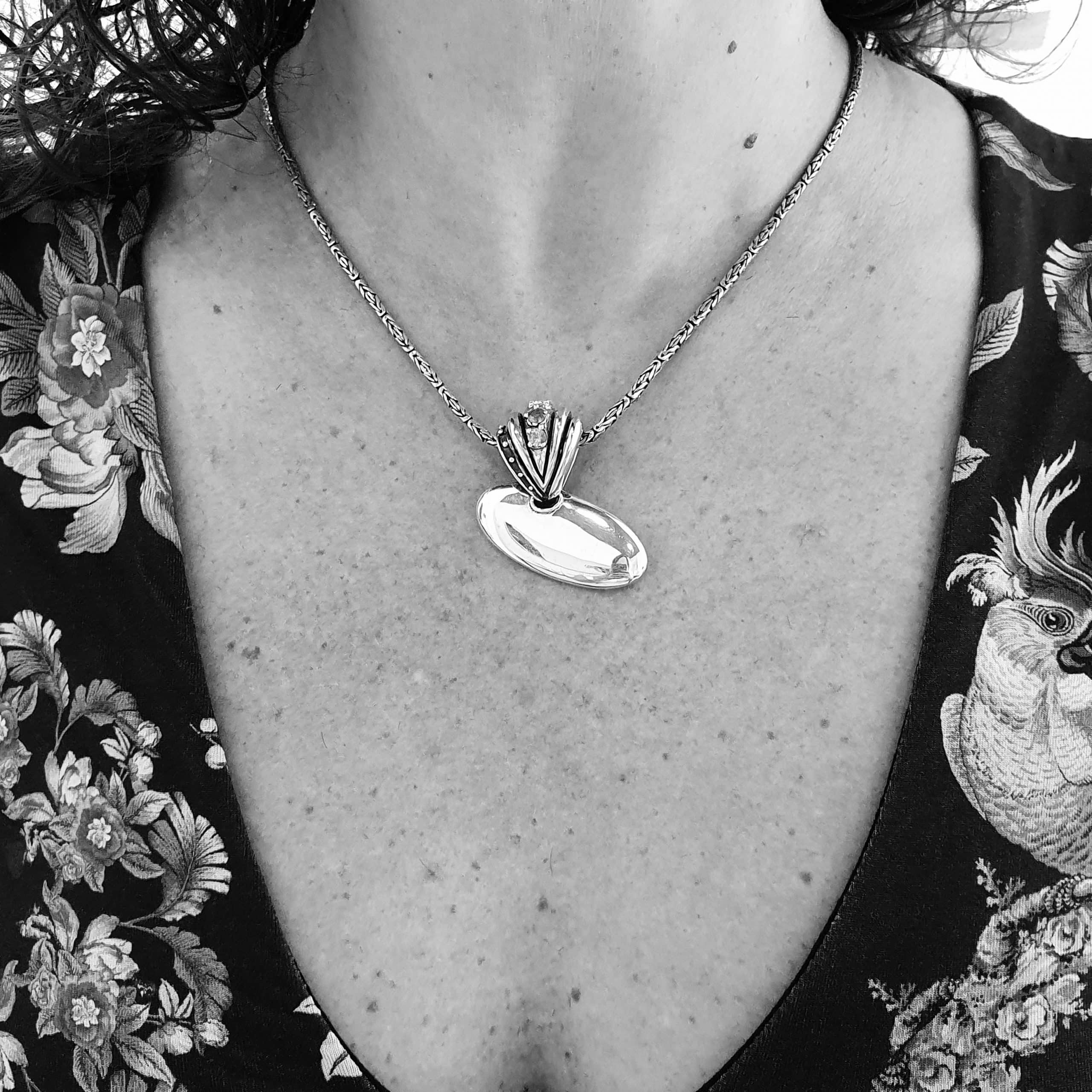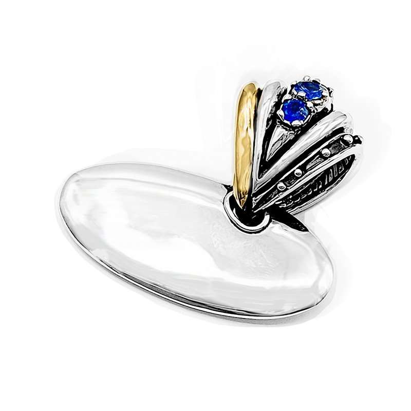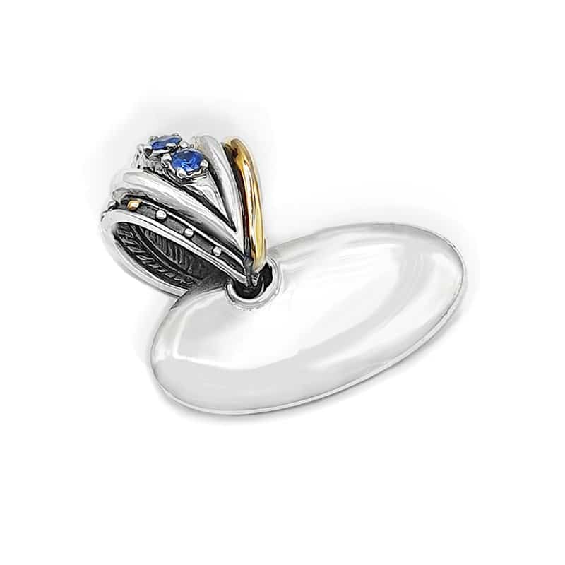 Twisted Shield Pendant handmade in silver with gold details and blue sapphires in the upper ring. Plain and smooth surface in both sides. The upper ring captures all the atention and it is engraved in the inside.